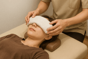 **目のツボ(攅竹・太陽・承泣・風池)**に鍼やお灸で刺激を与え、血流を促進。